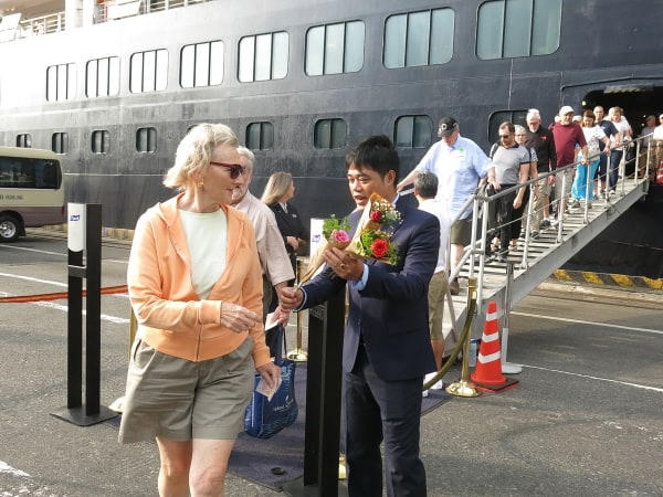 Tặng hoa chào đón vị khách xuống từ tàu du lịch biển