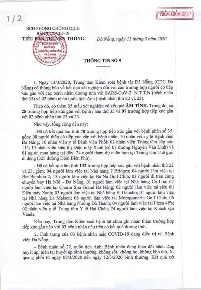 Như vậy, tổng cộng đến nay, đã có kết quả âm tính 70 trường hợp tiếp xúc gần với bệnh nhân số 35, gồm: 8 người thân có tiếp xúc gần với bệnh nhân; 10 nhân viên y tế Bệnh viện Đà Nẵng; 10 nhân viên y tế Bệnh viện Phổi; 2 nhân viên Trung tâm cấp cứu 115; 13 nhân viên siêu thị Điện máy Xanh (số 7 đường Nguyễn Văn Linh) và 1 người mua hàng tại đây; 24 người tham dự cuộc họp tại Trung tâm Thế giới di động (325 đường Điện Biên Phủ).