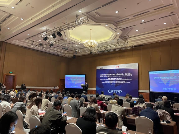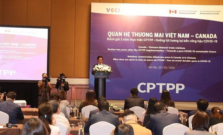Sáng nay – 23/3, tại Hà Nội, Phòng Thương mại và công nghiệp Việt Nam (VCCI) phối hợp với Đại sứ quán Canada tại Hà Nội tổ chức Hội thảo "Quan hệ thương mại Việt Nam – Canada: Đánh giá 2 năm thực hiện Hiệp định Đối tác Toàn diện và Tiến bộ xuyên Thái Bình Dương (CPTPP) và hướng tới tương lai bền vững hậu Covid-19."