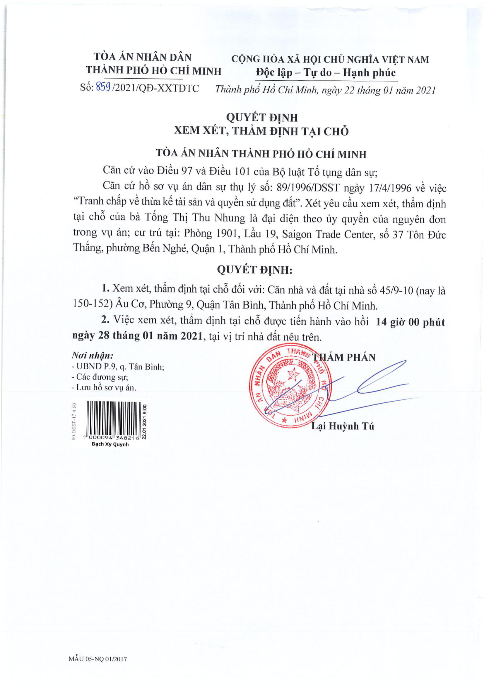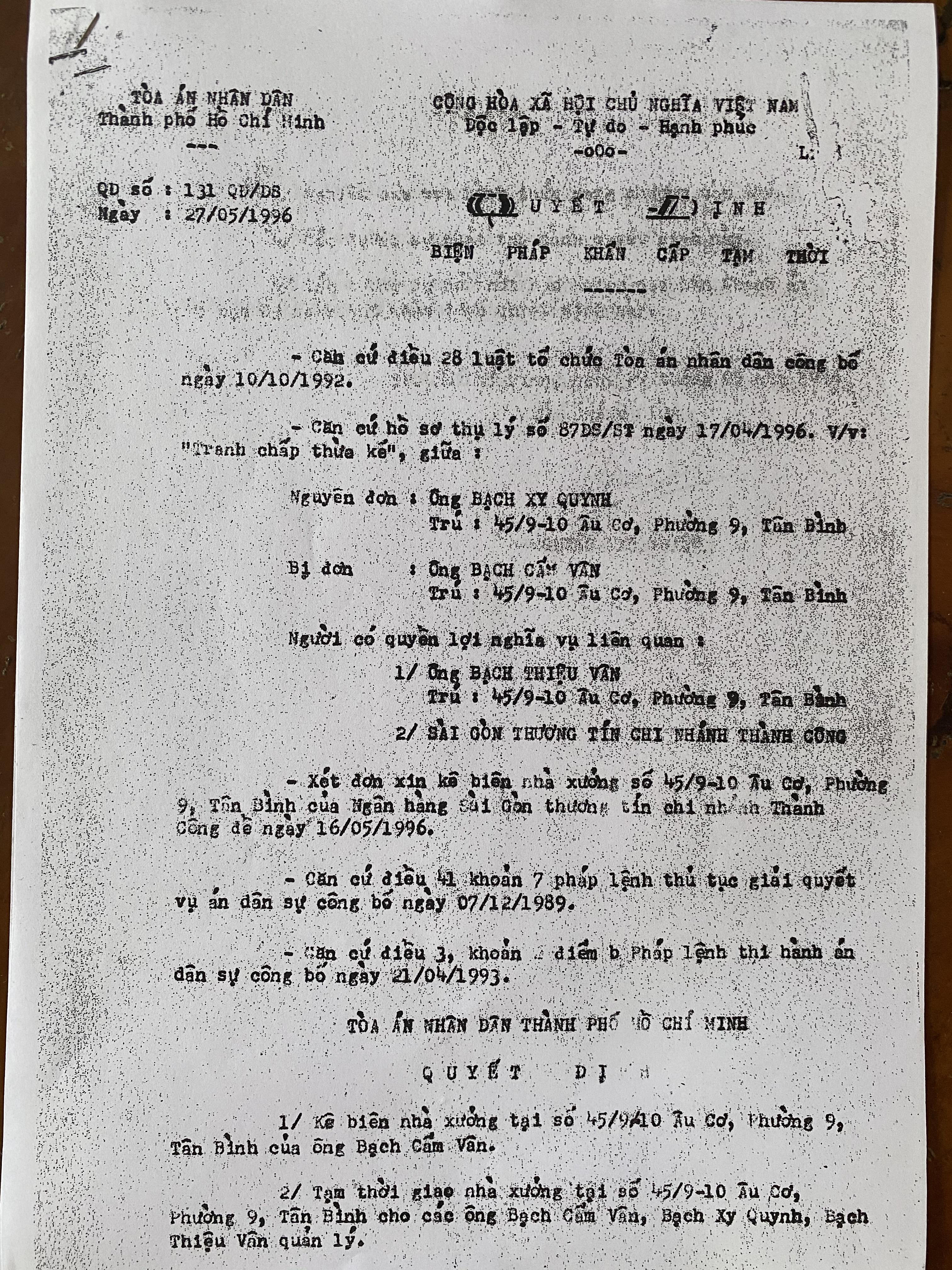 Ngày 27/05/1996, TAND TP.HCM đã ban hành Quyết định Biện pháp khẩn cấp tạm thời số 131/QĐ/DS với nội dung: “Kê biên nhà xưởng tại số 45/9-10 (nay là số 150 -152) đường Âu Cơ, của ông Bạch Cẩm Vân, tạm thời giao nhà xưởng nêu trên cho các ông Bạch Cẩm Vân, Bạch Xy Quyh và Bạch Thiệu Vân quản lý, nghiêm cấm mọi hình thức sang nhượng cầm thế...”.