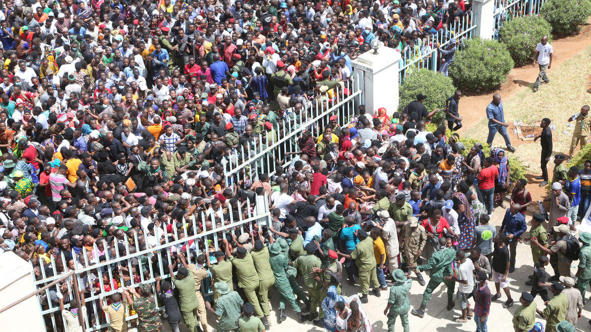 Đám đông người dân đã chen lấn tìm cách vào bên trong sân vận động Uhuru để bày tỏ tiếc thương và nhìn mặt cố Tổng thống John Magufuli lần cuối.