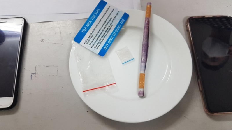 Tại đây, lực lượng công an phát hiện một đĩa sứ trắng, một ống hút bằng giấy, một thẻ cư dân tòa nhà chung cư và một túi nilon nhỏ bên trong có tinh thể màu trắng nghi là ketamine.