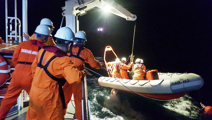 Sau khoảng 5 giờ vượt sóng dữ, đến 22h45 cùng ngày, lực lượng cứu nạn hàng hải đã tiếp cận được tàu cá BĐ 97692 TS. 7 thuyền viên yếu sức, hoảng loạn được đưa lên tàu SAR 412 chăm sóc y tế tích cực.