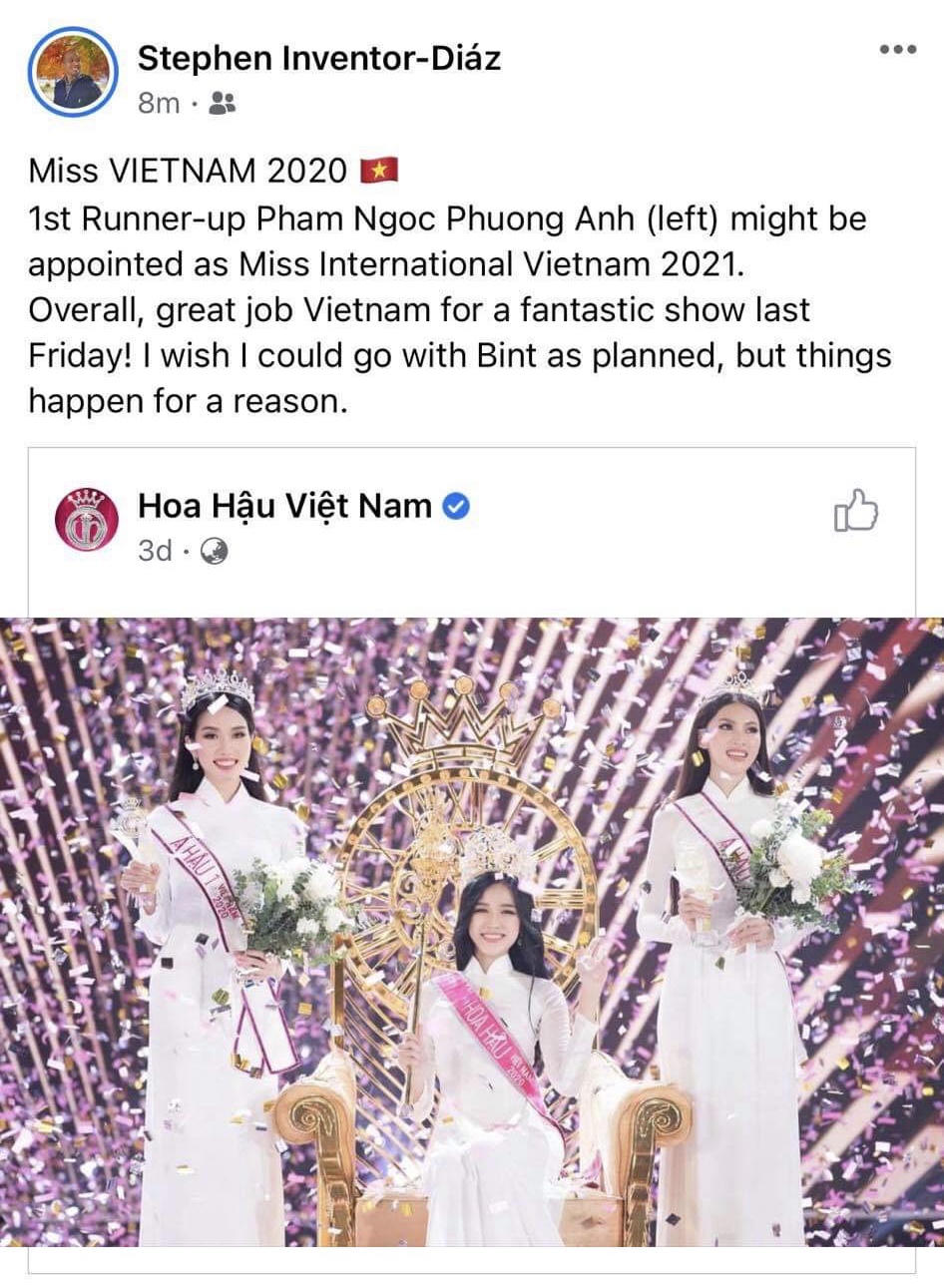 Trên trang cá nhân của mình, Stephen - Giám đốc truyền thông cuộc thi Miss International cũng dành nhiều lời khen ngợi và hy vọng cô đến với cuộc thi Miss International. Những điều này có thể góp phần khích lệ Phương Anh thêm lửa để có thể đặt chân tới Miss International.