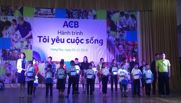 Cũng trong dịp này, ngân hàng ACB đã tổ chức chương trình từ thiện “Hành trình tôi yêu cuộc sống 2020” tại thị xã Hương Thủy (tỉnh TT- Huế). Tại đây, ngân hàng ACB đã trao tặng 50 xe đạp (trị giá 1.200.000 đồng/ chiếc) và 100 phần quà cho các em học sinh có thành tích xuất sắc trị giá 500.000/phần quà, 100 phần quà cho hộ nghèo trên địa bàn thị xã. Đây là một trong những hoạt động mà ngân hàng ACB thường xuyên thực hiện với mục tiêu giúp thế hệ tương lai thêm động lực và niềm tin trên con đường học tập cũng như chia sẻ trách nhiệm với cộng đồng địa phương nơi ACB hiện diện.