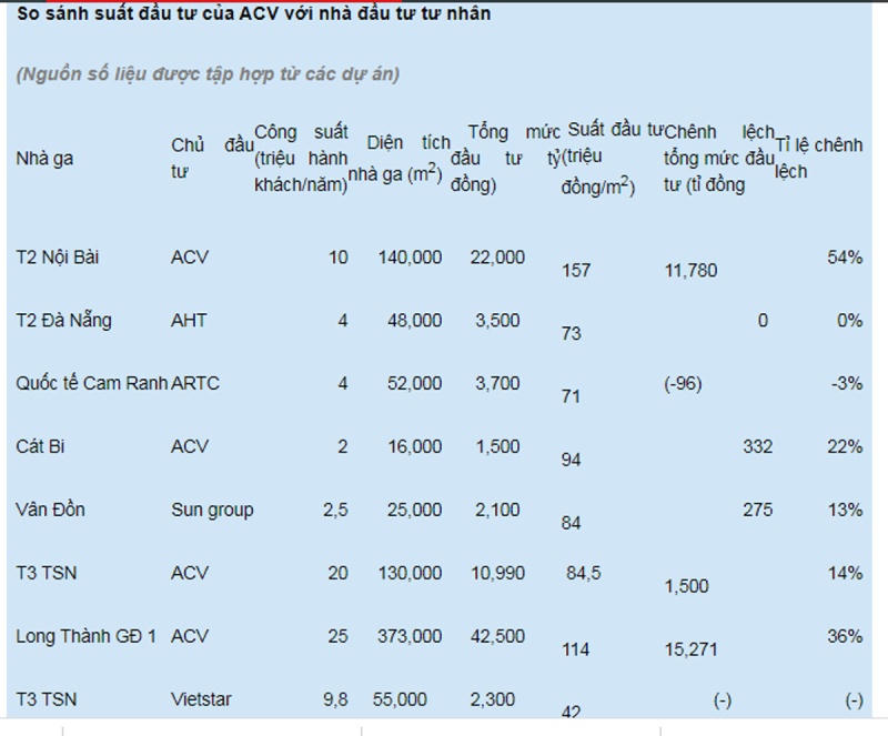 Trong khi đó, các nhà ga do ACV đầu tư có suất đầu tư rất cao. Nhà ga quốc tế T2 Nội Bài có vốn đầu tư 22.000 tỉ đồng và suất đầu tư bình quân lên tới 157 triệu đồng/m2; Cát Bi 94 triệu đồng/m2; Long Thành (do ACV lập dự án khả thi và Bộ GTVT đề nghị giao ACV làm chủ đầu tư, giai đoạn 1 có vốn đầu tư 111.000 tỉ đồng, trong đó hạng mục nhà ga 42.500 tỉ đồng) suất đầu tư nhà ga bình quân 114 triệu đồng/m2.