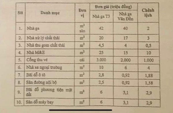 Cụ thể, nhà ga quốc tế T2 Đà Nẵng (công trình xã hội hóa đầu tiên trong ngành hàng không) do Công ty cổ phần đầu tư khai thác cảng hàng không nhà ga quốc tế Đà Nẵng (AHT) làm chủ đầu tư. Nhà ga có suất đầu tư bình quân 73 triệu đồng/m2. Nhà ga quốc tế Cam Ranh do Công ty cổ phần nhà ga quốc tế Cam Ranh (CRTC) đầu tư, có suất đầu tư bình quân 71 triệu đồng/m2. Ngay cả cảng hàng không quốc tế Vân Đồn, do điều kiện xây mới hoàn toàn ở nơi có chi phí cao với nhiều hạng mục kèm theo nhà ga thì suất đầu tư bình quân cũng chỉ 84 triệu đồng/m2.