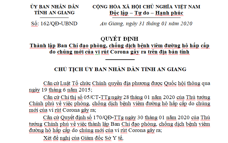(PLVN) - Ngày 31/1, thông tin từ Văn phòng UBND tỉnh An Giang cho biết: Chủ tịch UBND tỉnh Nguyễn Thanh Bình vừa ban hành quyết định thành lập Ban Chỉ đạo phòng, chống dịch bệnh viêm đường hô hấp cấp do chủng mới của virus Corona (nCoV) trên địa bàn tỉnh.