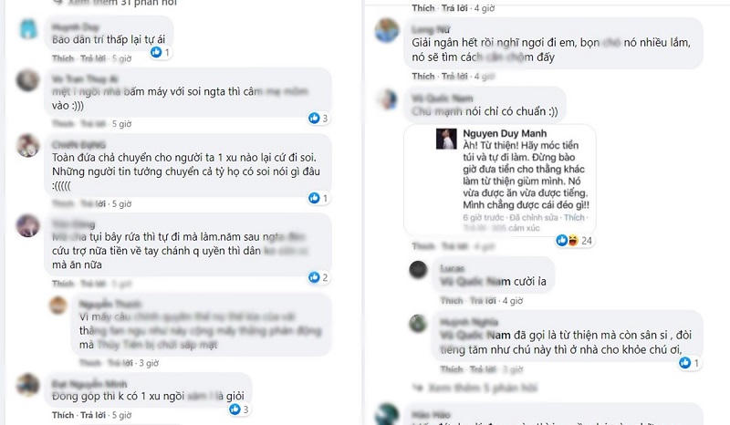 Và sự “phân tích” này không những không nhận được sự đồng tình của cư dân mạng mà thậm chí còn khiến nhiều người phẫn nộ khi cho rằng hành động liên tục soi mói, nghi ngờ và chất vấn Thủy Tiên là điều quá tệ. Trong khi cô đã không quản hiểm nguy đi vào tâm bão lũ, trao tận tay đồng bào, bà con khi cơ cực. Chưa kể, gia đình cô cũng tự nguyện giúp đỡ bà con số tiền gần 4 tỷ đồng, bỏ lại cuộc sống nhung lụa phía sau để vừa bị thiệt hại hợp đồng công việc, vừa bị chửi rủa, liệu có đáng? Tủy Tiên chia sẻ, nhiều lúc cô muốn dừng lại, nhiều lúc cô trầm cảm, cả đêm khóc ròng vì cực nhọc, vậy mà antifan vẫn không buông tha…