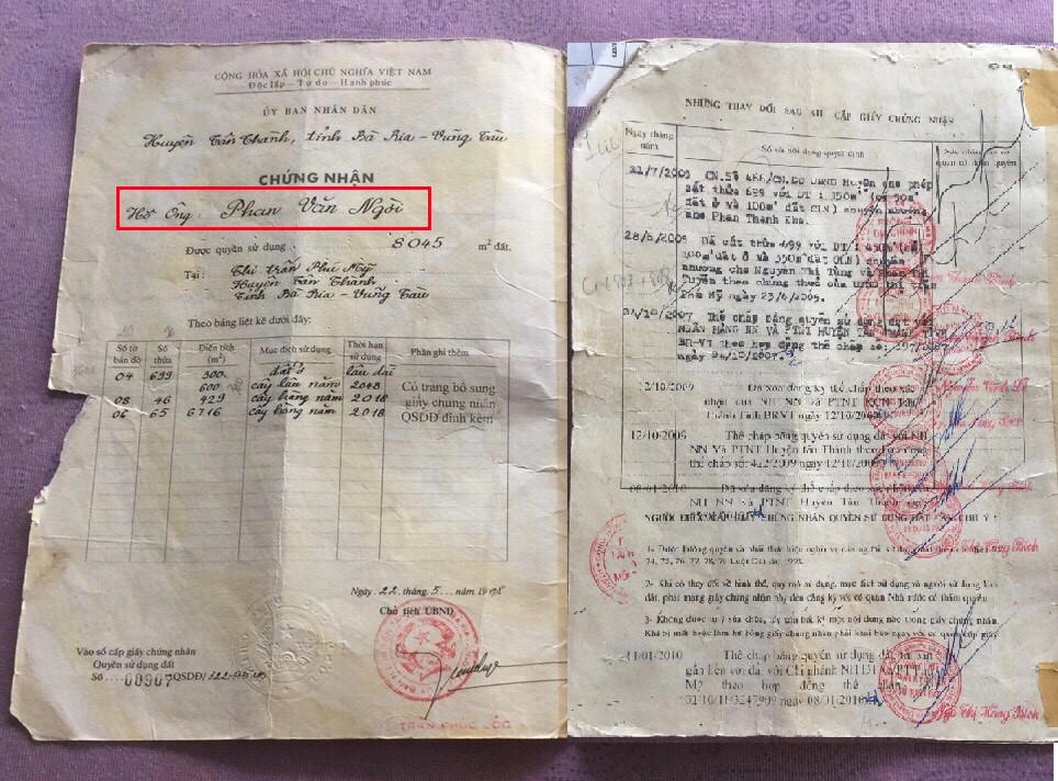 Ngày 22/5/1998, hộ ông Phạm Văn Ngời được UBND huyện Tân Thành (nay là thị xã Phú Mỹ) cấp GCNQSDĐ cho 8045m2, trong đó có 300m2 đất ở, 600m2 đất cây lâu năm, còn lại hơn 7000m2 là đất cây hàng năm.