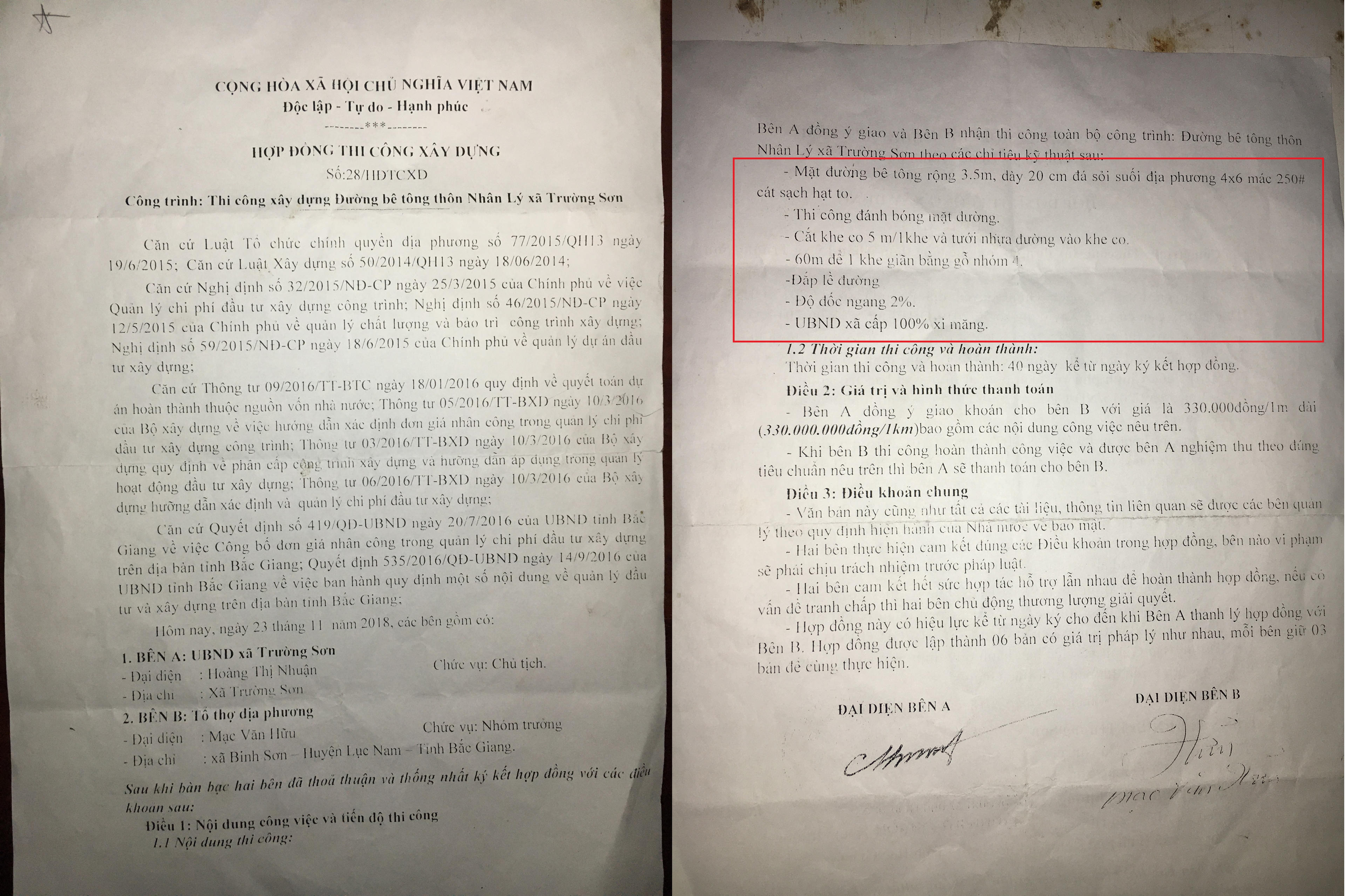 Tại buổi làm việc, khi được hỏi về việc tồn tại hai bản hợp đồng số 28/HĐTCXD ký ngày 23/11/2018 và 09A/2018/HĐ-TC ký ngày 1/10/2018 đều được ký bởi bà Hoàng Thị Nhuận và tổ Thợ địa phương, bà Hoàng Thị Nhuận cho biết, thực hiện chủ trương chính sách của huyện Lục Nam, xã Trường Sơn tiến hành vận động nhân dân các thôn trong đó có thôn Nhân Lý đóng góp để thực hiện thi công tuyến đường bê tông liên thôn. UBND huyện Lục Nam yêu cầu hết tháng 12/2018 phải hoàn thành công trình, để đảm bảo thời gian các cán bộ chuyên môn đã tham mưu cho UBND xã là thực hiện 2 hợp đồng nêu trên, trước hết là để kịp thời gian và “giữ chân nhà thầu”.
