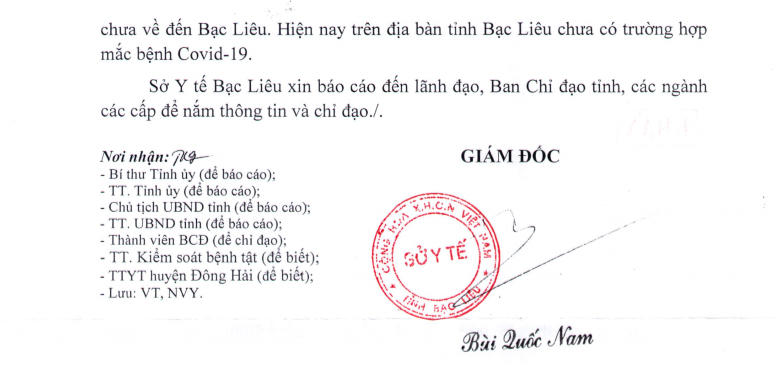 Giám đốc Sở Y tế tỉnh cũng khẳng định, hiện nay trên địa bàn tỉnh Bạc Liêu chưa có trường hợp nào mắc bệnh Covid-19./.