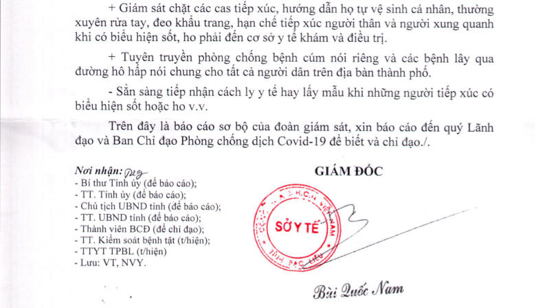 Bên cạnh đó, ông Bùi Quốc Nam cũng giao Trung tâm y tế TP Bạc Liêu giám sát chặt các cá nhân tiếp xúc với em K , đồng thời hướng dẫn họ tự vệ sinh cá nhân, thường xuyên rửa tay, đeo khẩu trang, hạn chế tiếp xúc với người thân và người xung quanh; và đặc biệt phải đến cơ sở y tế để khám, điều trị nếu có biểu hiện sốt, ho.