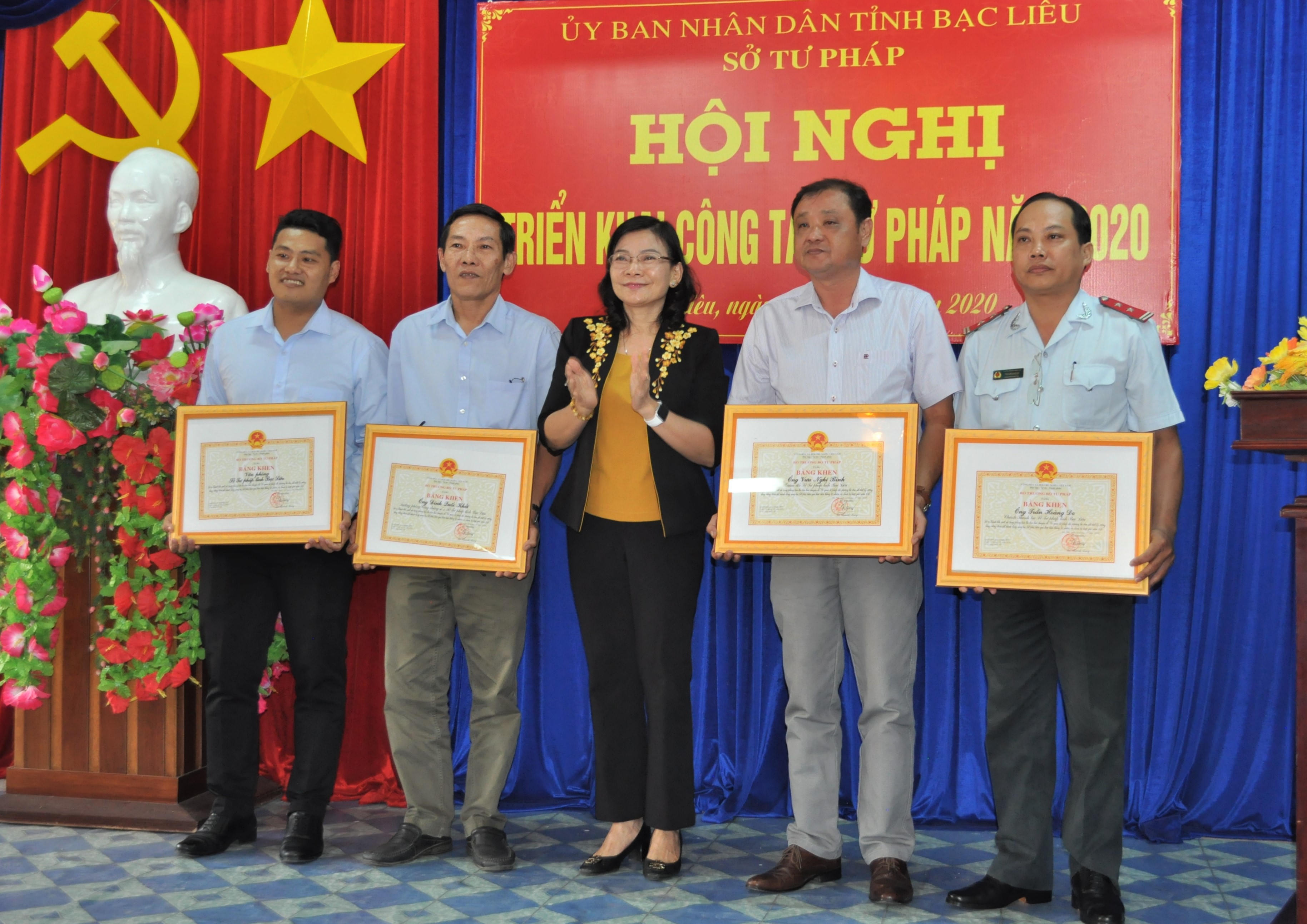 Phó Chủ tịch tỉnh Lâm Thị Sang cũng trao tặng 03 Danh hiệu tập thể Lao động xuất sắc và Bằng khen của Chủ tịch UBND tỉnh cho 10 tập thể và 20 cá nhân có thành tích xuất sắc trong công tác phổ biến, giáo dục pháp luật, hòa giải ở cơ sở và xây dựng cấp xã đạt chuẩn tiếp cận pháp luật năm 2019.