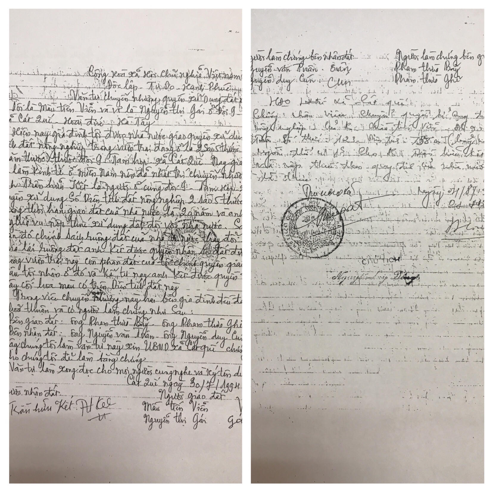 Hai văn tự được UBND xã Cát Quế chứng thực ngày 4/8/1994. Hai bên đã tiến hành giao tiền và tài sản trong tháng 8/1994. Ông Kết khẳng định buổi chuyển nhượng có mặt bà Gái, bà Gái có ký vào văn tự trước những người làm chứng. Gia đình ông Kết đã sử dụng từ đó đến nay. Nay bà Gái và các con đòi lại đất thì ông không chấp nhận.