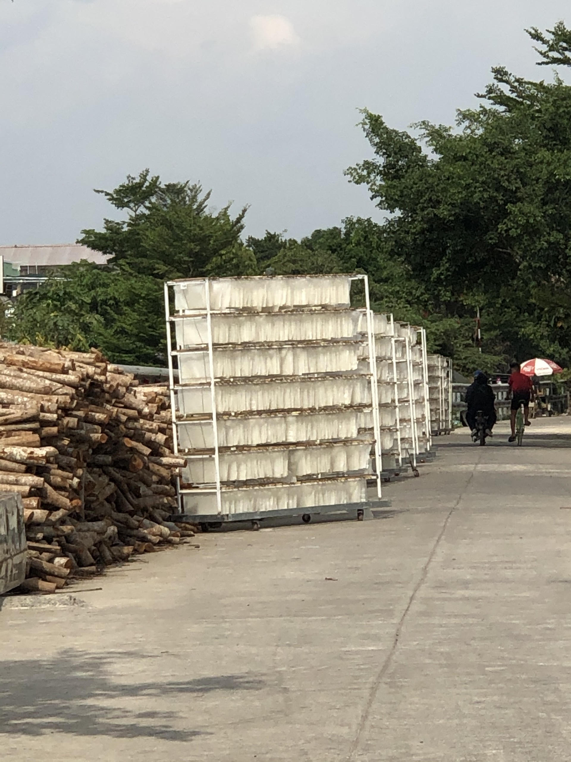 Điều khiến chúng tôi thắc mắc là vì sao, mặc dù có nhà kho rộng nhưng chủ cơ sở này lại cho công nhân kéo thẳng bánh tráng sau khi ra lò tới đường bê tông trước cơ sở để phơi.