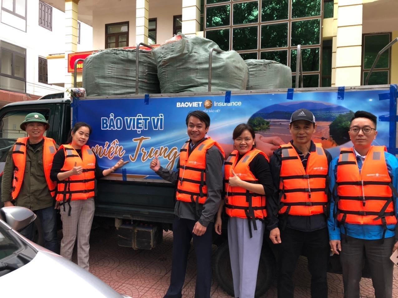 Bên cạnh đó, Tập đoàn Bảo Việt cũng trực tiếp đưa các chuyến xe chở hàng cứu trợ từ Hà Nội về các tỉnh miền Trung chịu ảnh hưởng nặng nề, phối hợp các công ty Bảo Việt tại địa phương đi thuyền, lội nước đến từng hộ gia đình để trao tận tay món quà thiết thực như áo phao, áo mưa bộ, nước uống đóng chai, đồ ăn cùng nhiều nhu yếu phẩm cần thiết khác.