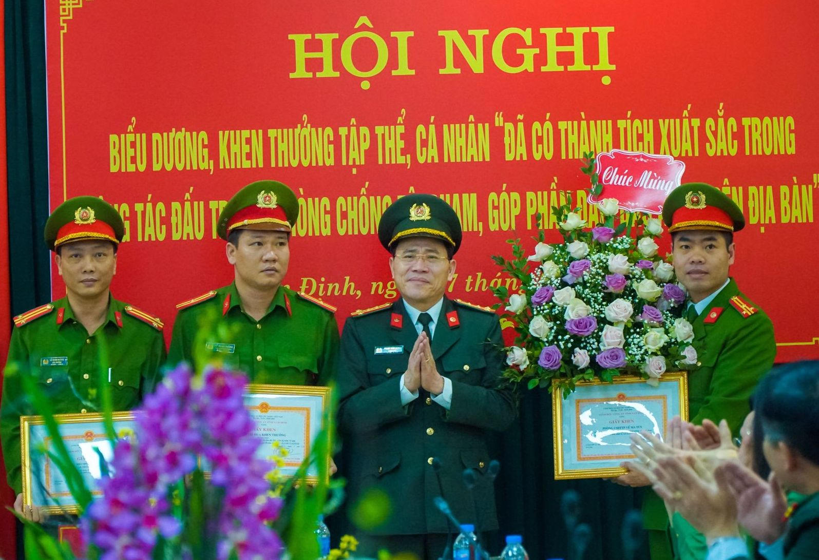 Giám đốc Công an tỉnh Nam Định Phạm Văn Long đã trực tiếp tuyên dương, khen thưởng, các cán bộ chiến sỹ công an tham gia phá án./.