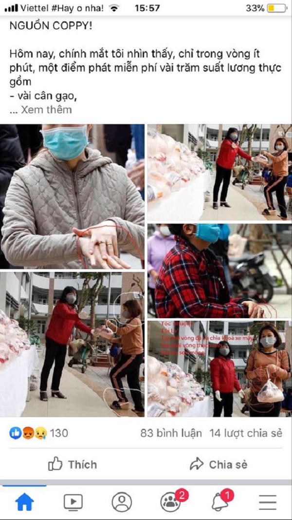 Cùng với dòng chia sẻ là những hình ảnh về một số người trưng diện nhiều trang sức đắt tiền nhưng lại đón nhận phần thực phẩm dành cho người khó khăn.