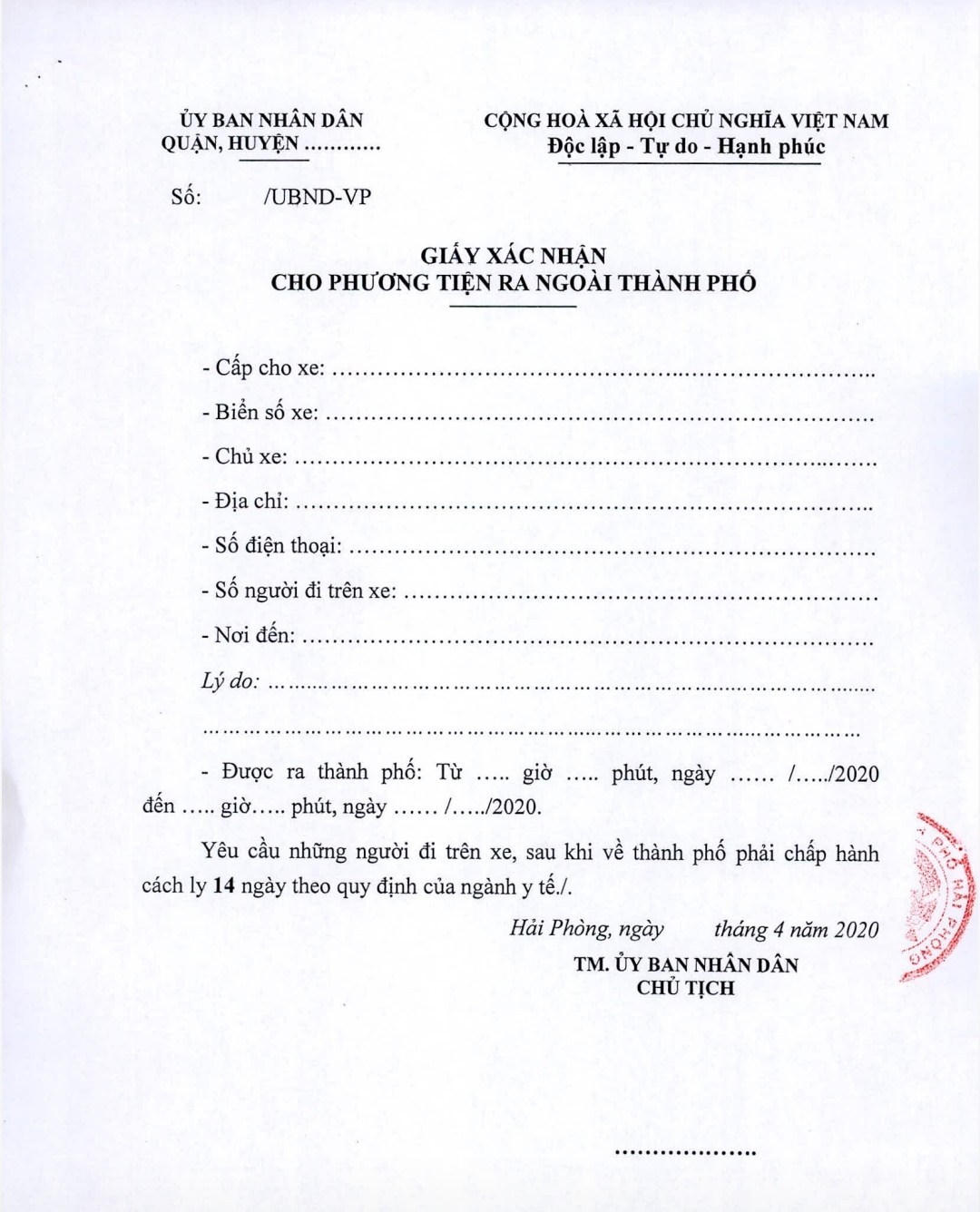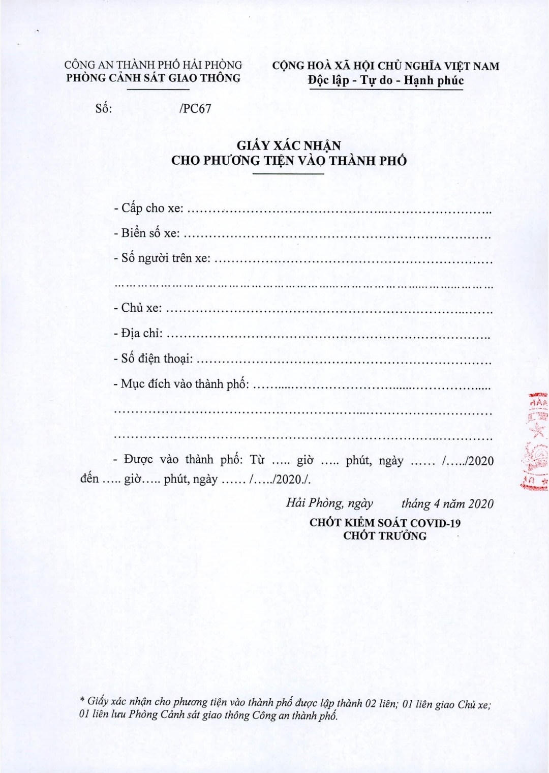 Để vào TP, các phương tiện phải đảm bảo yêu cầu của lực lượng chức năng. Phòng Cảnh sát giao thông đường bộ, đường sắt (Công an TP Hải Phòng) cung cấp mẫu “Giấy xác nhận cho phép các phương tiện vào TP” cho Chốt Kiểm soát của TP để quản lý và phát Giấy xác nhận cho phép phương tiện được vào TP.