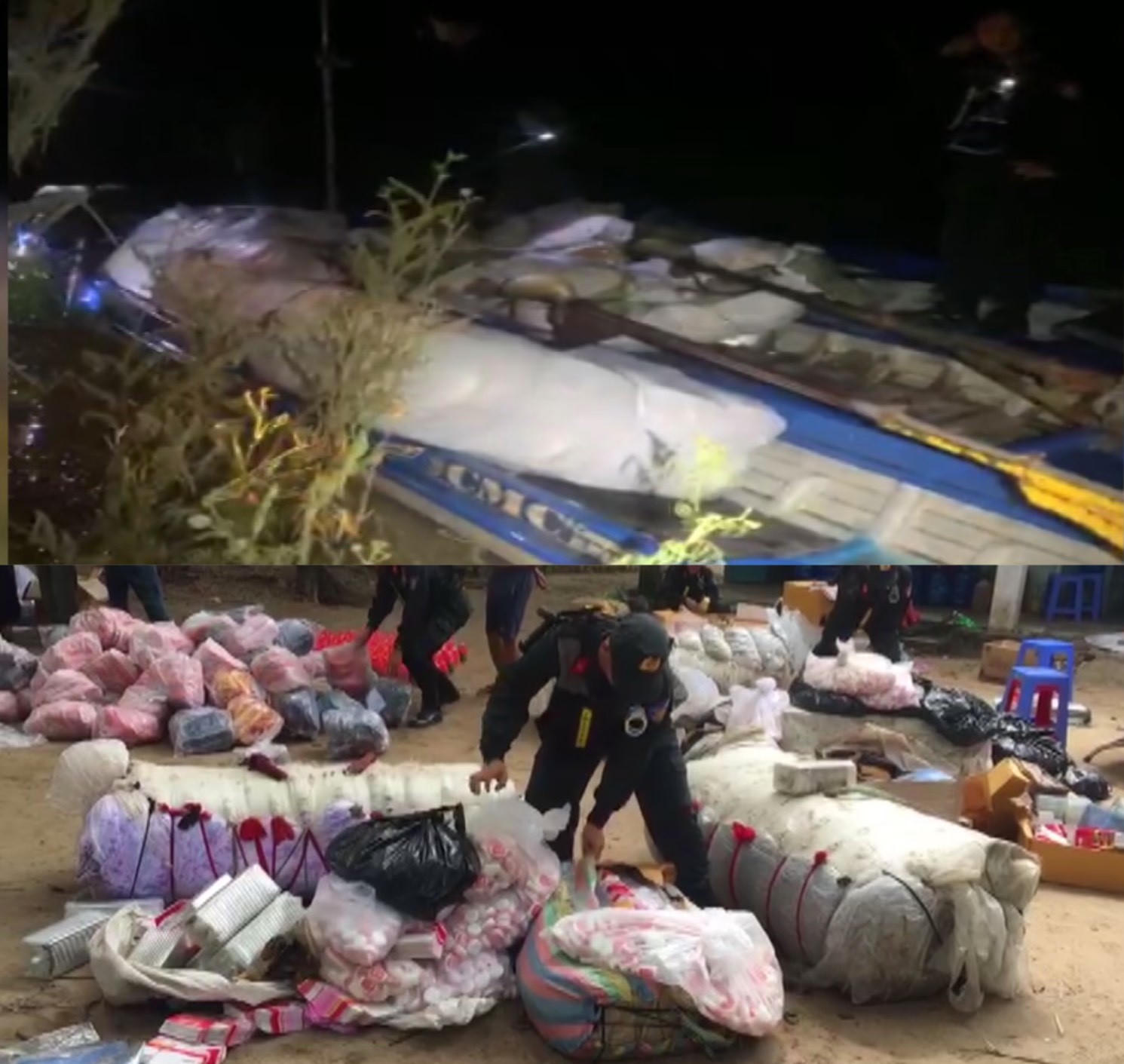 Phát hiện lực lượng chức năng, các đối tượng điều khiển xuồng máy đã nhanh chân bỏ trốn, bỏ lại phương tiện cùng tang vật. Qua kiểm tra, lực lượng chức năng phát hiện trên 6 xuồng máy đang vân chuyển nhiều mặt hàng như: thuốc trừ sâu, mỹ phẩm, nước hoa đều có nhãn hiệu nước ngoài; vải, tượng phật…ước tính trị giá ban đầu gần 500 triệu đồng.