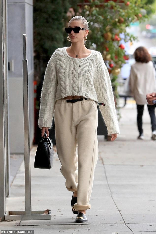 Chiếc áo len dệt kim dáng ngắn đơn giản trở nên thật đặc biệt khi được Hailey diện và để lộ cơ bụng săn chắc, khỏe khoắn. Cô phối cùng với quần lông cừu cạp cao cùng tông nhẹ nhàng tạo nên tổng thể hài hòa mà vẫn rất thời thượng. Hailey hoàn chỉnh set đồ với một đôi giày mules đen và một chiếc túi hợp thời trang.