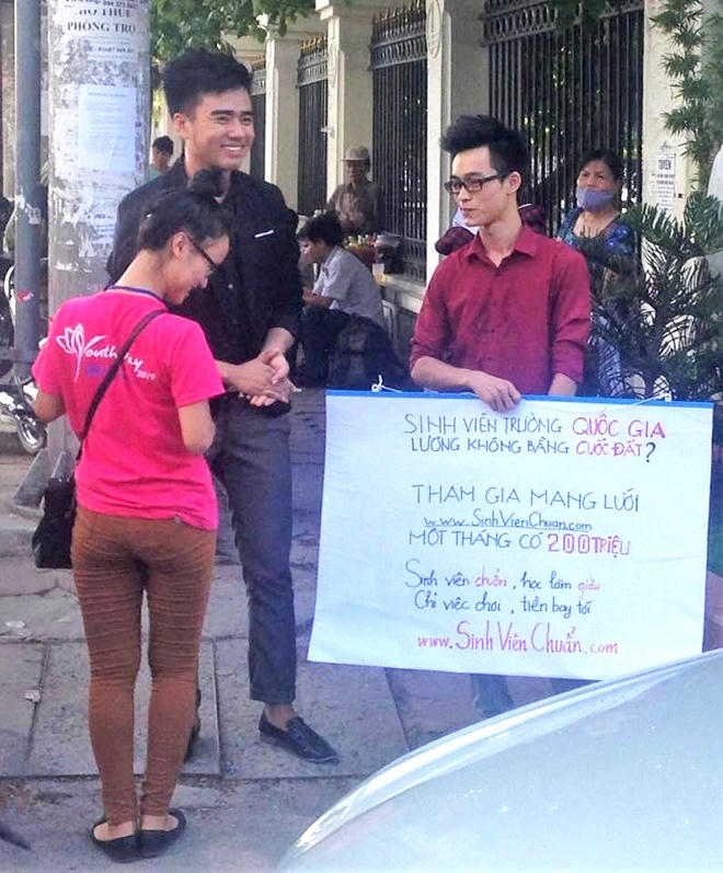 Tương tự, sinh viên Ng. H. N., sinh viên của Trường Đại học Kinh tế cũng mắc bẫy đa cấp. Đang đi làm thêm cho một quán cafe, N. được bạn đồng nghiệp thuyết phục đi làm thêm ở một nơi “nhiều tương lai” hơn. Sau khi mang CMND đi phỏng vấn ở một công ty có trụ sở tại tòa nhà của một siêu thị điện máy tại đường CMT8, quận 10, TP.HCM, N. được thanh niên tên T. nhận vào làm ngay với số tiền đóng vào ban đầu là 450 nghìn đồng cho bộ hồ sơ tiếp nhận công việc.
