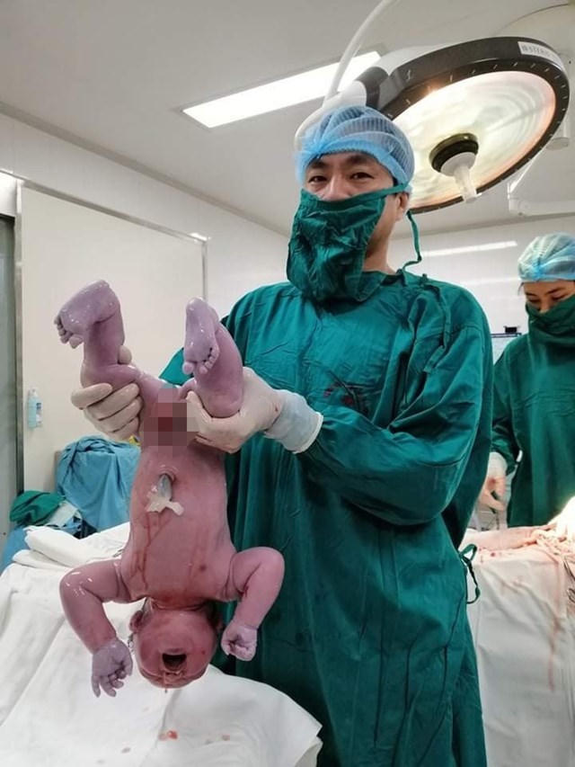 Gia đình sản phụ đăng ký sinh mổ khoa thường và yêu cầu BSCKI Nguyễn Xuân Hải phó khoa D5. Kíp bác sĩ đã mổ lấy thai bằng đường rạch ở bụng, bé trai ra đời an toàn với cân nặng 5390g trước sự bất ngờ của mẹ và ê kíp phẫu thuật.