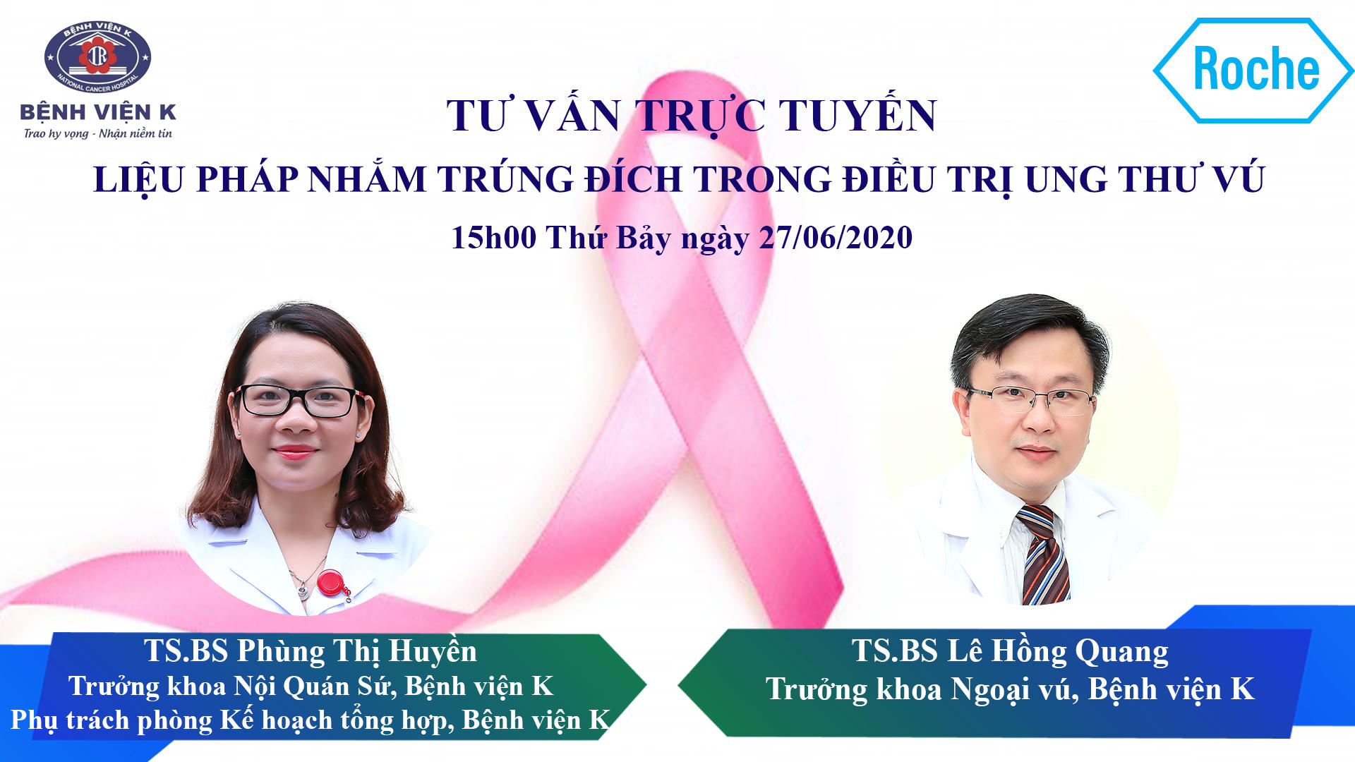 (PLVN) - Thời gian qua, Bệnh viện K đã đồng hành cùng nhiều đơn vị để thực hiện chương trình. Đặc biệt từ tháng 06/2020 đến tháng 12/2020, Roche Việt Nam đã dành sự ủng hộ với chuỗi chương trình tư vấn trực tuyến của Bệnh viện K, theo đó các chương trình sẽ được phát trực tiếp trên kênh Youtube và Fanpage của bệnh viện K vào lúc 10h00, Thứ Bảy hàng tuần.