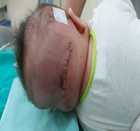 Với trường hợp bé Lê Thiên A, 3 tháng tuổi, sau đẻ xuất hiện khối u vùng chẩm, kích thước 3 x 4 cm, có da lành che phủ. Bệnh nhân được khám và chẩn đoán khối u vùng chẩm và tiếp tục theo dõi, 03 tháng sau bệnh nhân tái khám, nhập viện.