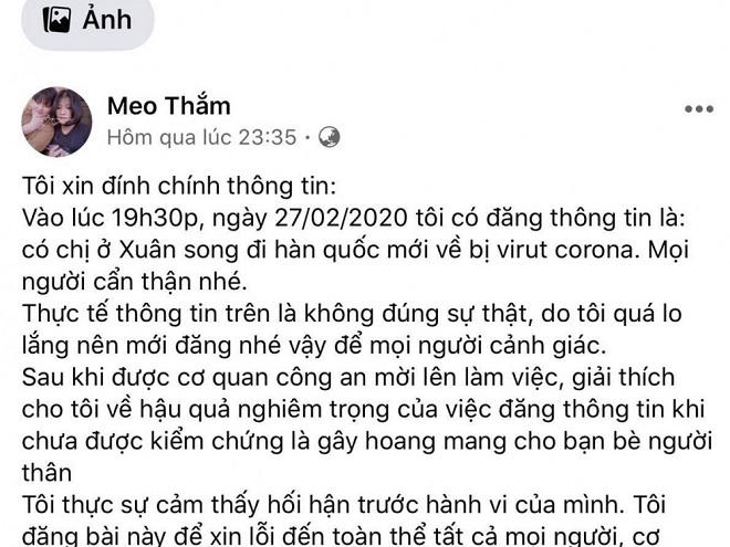 Theo đó, khoảng 18h35’ ngày 27/2, trên trang Facebook “Meo Thắm” đã đăng tải bài viết với nội dung “Mọi người ơi! Ở Xuân Song có chị đi Hàn Quốc về bị virus corona rồi. Chị về trước khi bệnh phát tán, tưởng không bị ai ngờ giờ lại bị... chắc chị tiếp xúc cũng khá nhiều người rồi. Mọi người cẩn thận nhé”.