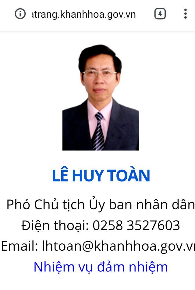 (PLVN) - Phó Chủ tịch UBND TP Nha Trang Lê Huy Toàn dự kiến sẽ hầu tòa trong ngày 21/2 liên quan đến các sai phạm xảy ra tại dự án Khu đô thị Hoàng Long. Điều đáng nói là sau hơn một năm bị khởi tố, hiện trên Trang thông tin điện tử TP Nha Trang, ông Lê Huy Toàn vẫn được “giữ” hình ảnh, chức vụ Phó Chủ tịch UBND TP Nha Trang, cùng số điện thoại cơ quan, email công vụ.