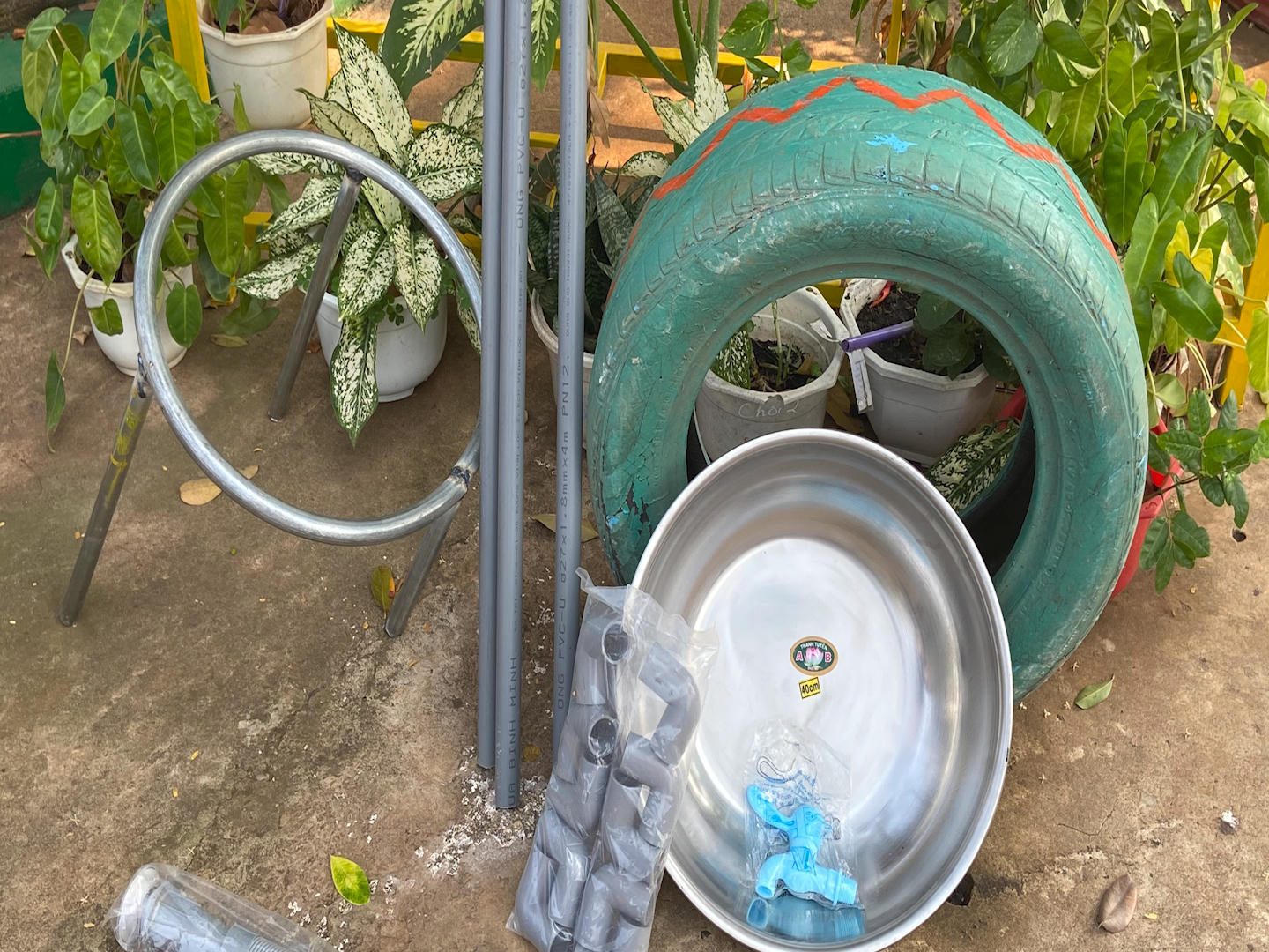 Để tái chế một chiếc chậu rửa, quan trọng nhất là cần những chiếc lốp xe hơi vừa tầm học sinh, trong khi tại địa phương lại ít tiệm có, hoặc có thì cũng chỉ là lốp xe tải cỡ lớn, không đáp ứng tiêu chuẩn.