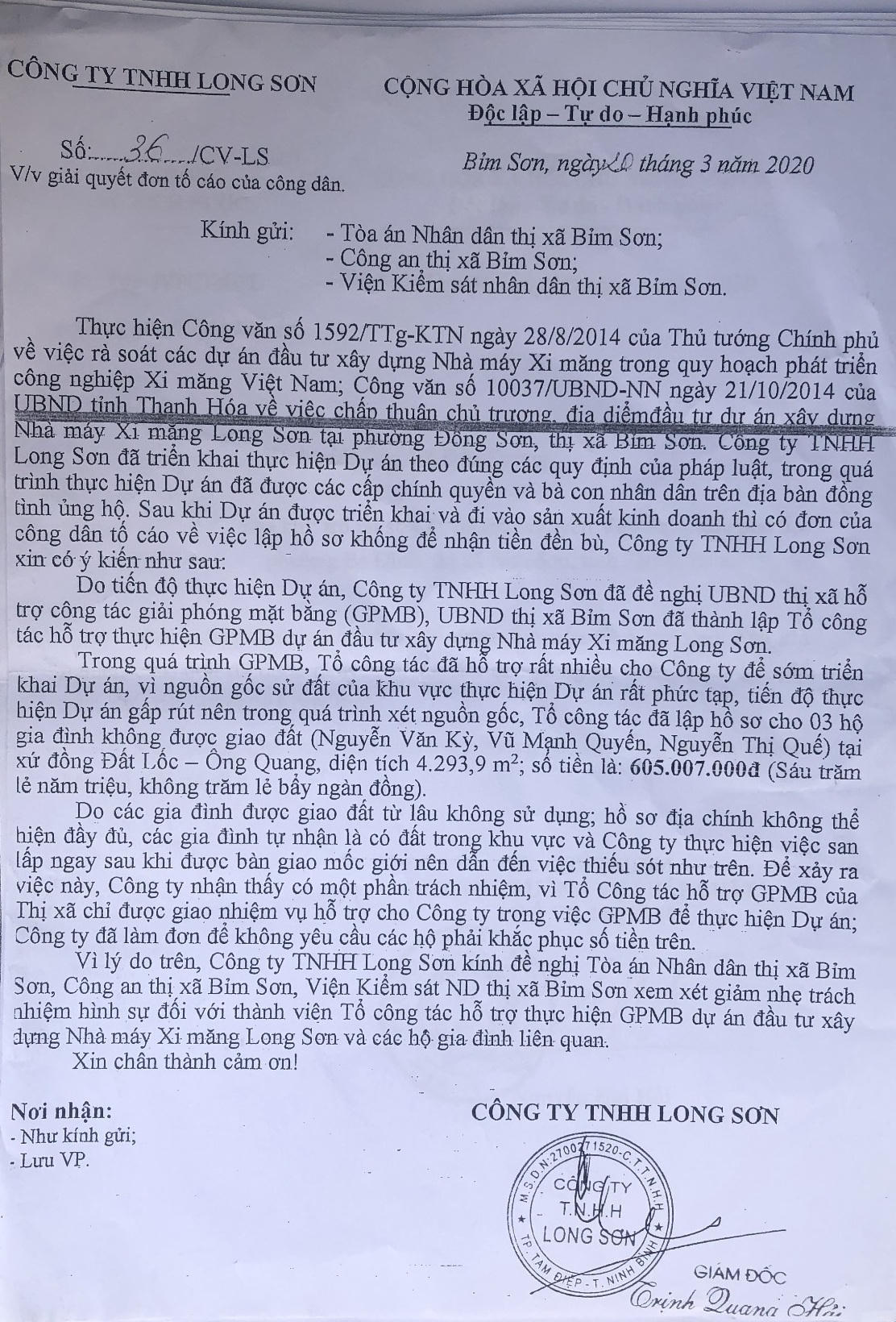 Theo tài liệu thu thập được, Công ty TNHH Long Sơn ngày 20/3/2020 đã có công văn số 06/CV-LS gửi các cơ quan tố tụng Thị xã Bỉm Sơn, trong đó nhận một phần trách nhiệm, không yêu cầu các hộ dân phải khắc phục số tiền chi trả cho 3 hộ gia đình lập hồ sơ “khống” tại xứ đất Đồng Lốc-Ông Quang và đề nghị xem xét giảm nhẹ trách nhiệm hình sự đối với các thành viên Tổ công tác hỗ trợ thực hiện GPMB dự án Nhà máy Xi măng Long Sơn.