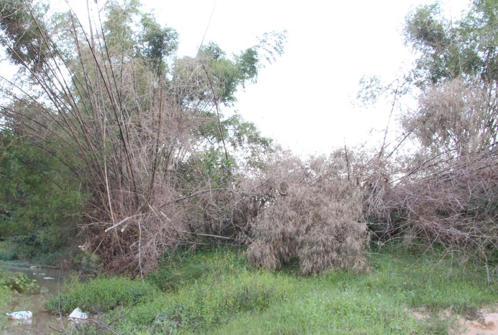Theo quan sát của chúng tôi, hộ ông Dương chỉ mới chặt một vài lùm tre rồi bỏ ngổn ngang giữa lòng sông; hàng chục lùm tre xanh tốt khác vẫn đang “án ngữ” xung quanh diện tích đất bãi bồi trồng keo này. Bên cạnh đó, số nhánh tre, đoạn tre được ông Dương chặt rồi vùi xuống lòng sông dài hàng trăm mét trước đây vẫn nằm “chễm chệ”, ngăn dòng chảy tự nhiên, gây ngập úng một số diện tích đất sản xuất nông nghiệp của người dân.