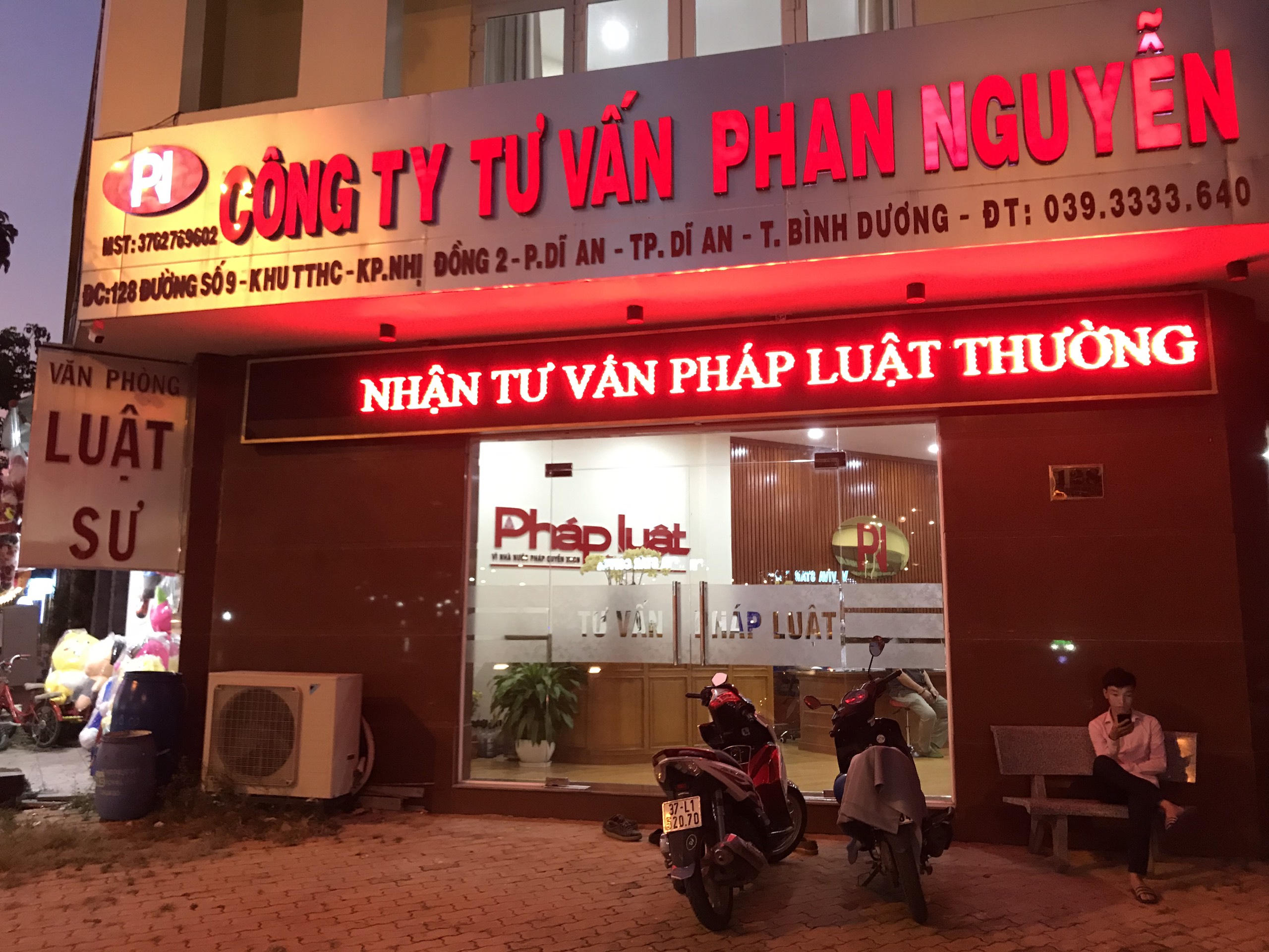 Để xác minh sự việc, phóng viên đã tiếp cận trụ sở Công ty tư vấn Phan Nguyễn, địa chỉ tại số 128, đường số 9, khu trung tâm hành chính, khu phố Nhị Đồng 2 phường Dĩ An, TP Dĩ An, tỉnh Bình Dương. Đây là văn phòng có treo biển Báo Pháp luật Việt Nam với hình ảnh là logo của Báo.