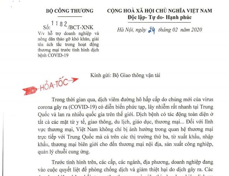 Ngày 24/2/2020, Bộ Công Thương có công văn hỏa tốc đề nghị Bộ Giao thông vận tải (GTVT) phối hợp với Bộ Tài chính giảm giá vé BOT, phí cầu đường, bến bãi để tháo gỡ khó khăn cho doanh nghiệp trong dịch Covid-19.