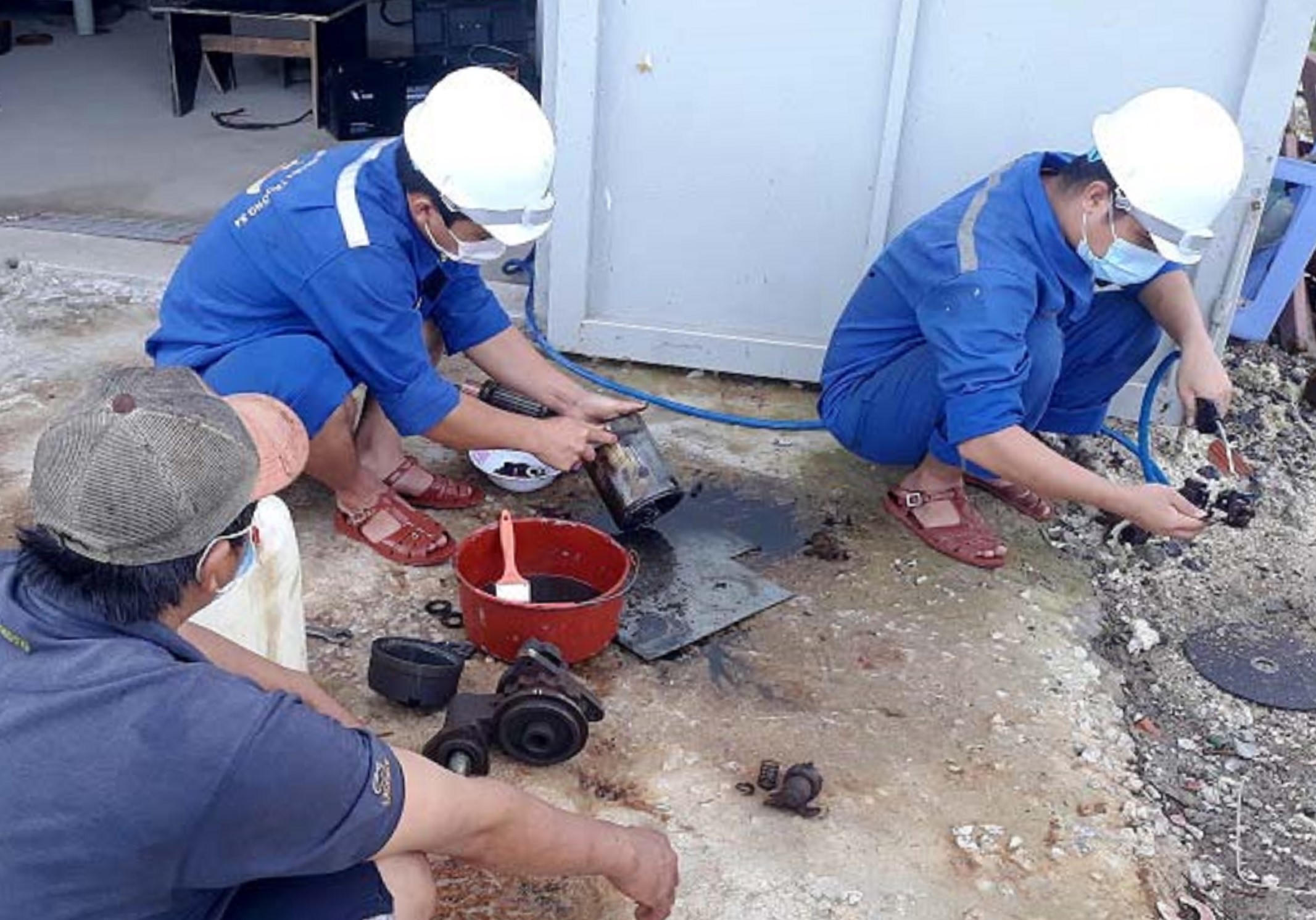 Các nhân viên kỹ thuật của Trung tâm Dịch vụ HC-KT đảo Sinh Tồn nhanh chóng kiểm tra và tiến hành sửa chữa. Đến 9 giờ 30 phút ngày 3/1, cả 2 sự cố trên của tàu cá PY 90477 TS được khắc phục xong và gia cố neo.