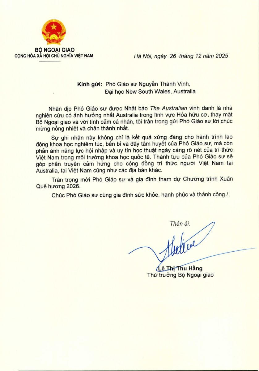 Nhân dịp Phó Giáo sư Nguyễn Thành Vinh, Đại học New South Wales (Australia), được Nhật báo The Australian vinh danh là nhà nghiên cứu có ảnh hưởng nhất Australia trong lĩnh vực Hóa hữu cơ, thay mặt Bộ Ngoại giao và với tình cảm cá nhân, Thứ trưởng Bộ Ngoại giao Lê Thị Thu Hằng đã gửi Thư chúc mừng, ghi nhận những đóng góp nổi bật của ông đối với khoa học và cộng đồng trí thức Việt Nam ở nước ngoài.