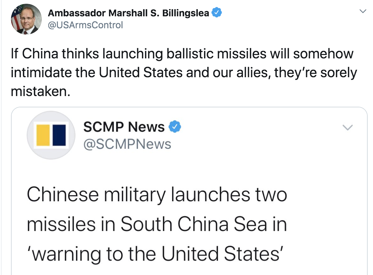 (PLVN) - Trung Quốc quá sai lầm khi cho rằng việc phóng tên lửa đạn đạo ở Biển Đông có thể đe dọa Mỹ, Đặc phái viên của Tổng thống Mỹ về kiểm soát vũ khí Marshall Billingslea tuyên bố trên Twitter.