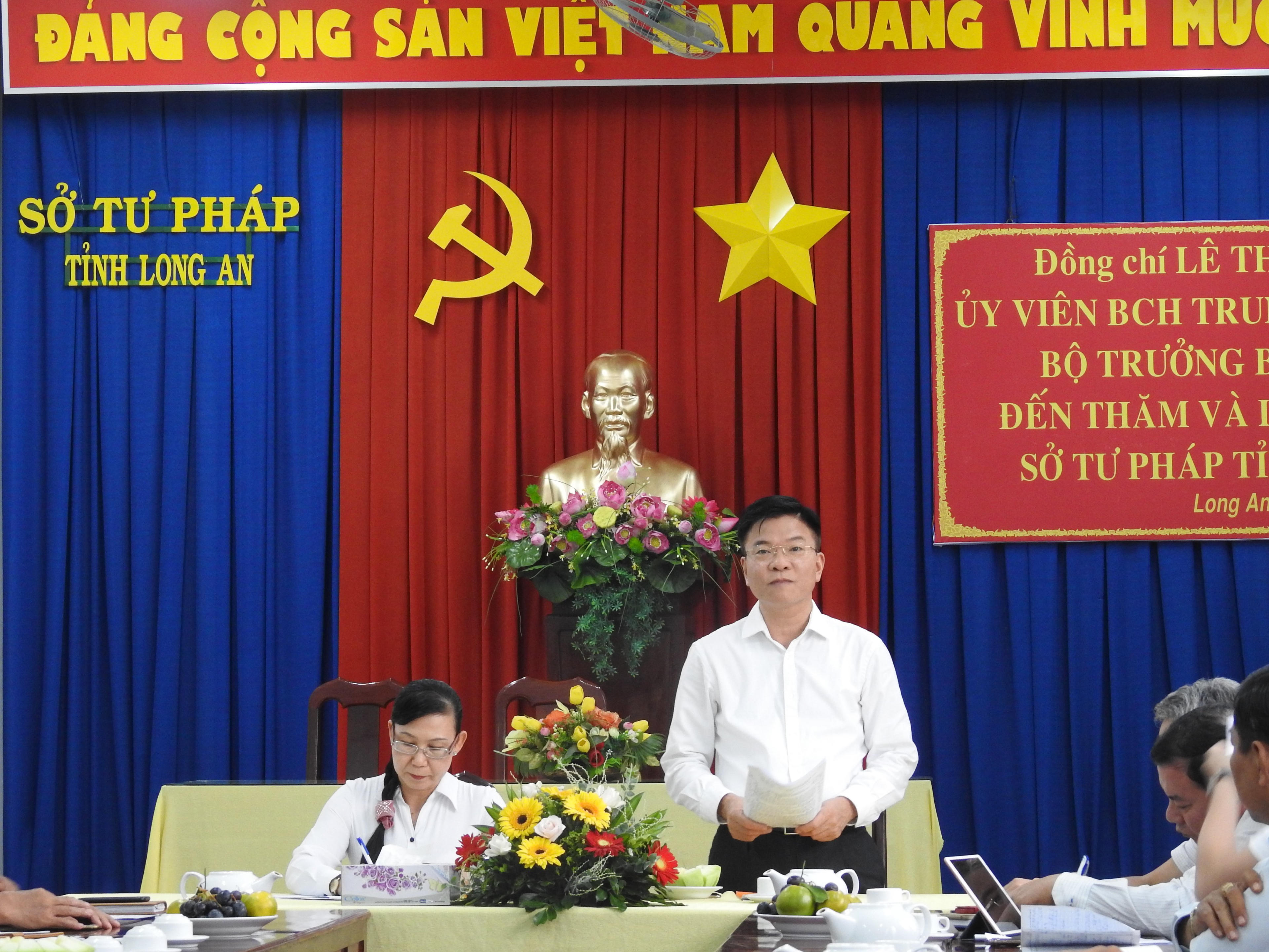 Phát biểu tại buổi làm việc, Bộ trưởng Bộ tư pháp Lê Thành Long đã thông tin về tình hình công việc của Bộ Tư pháp trong nhiệm kỳ vừa qua, đặc biệt là từ năm 2019 – 2020; Đồng thời ghi nhận, chia sẻ những khó khăn và đóng góp cho sự phát triển địa phương của Cục THADS và Sở Tư pháp tỉnh Long An. Thời gian tới, ngành Tư pháp Long An cần tăng cường kiểm tra, giám sát, thanh tra, xử lý vi phạm đối với các hoạt động bổ trợ tư pháp và hành chính tư pháp; Áp dụng, vận dụng công nghệ thông tin trong công tác quản lý hành chính; Xây dựng chất lượng con người trong công tác chỉ đạo, điều hành để đảm bảo tốt yêu cầu về công tác, kế hoạch đã đặt ra…