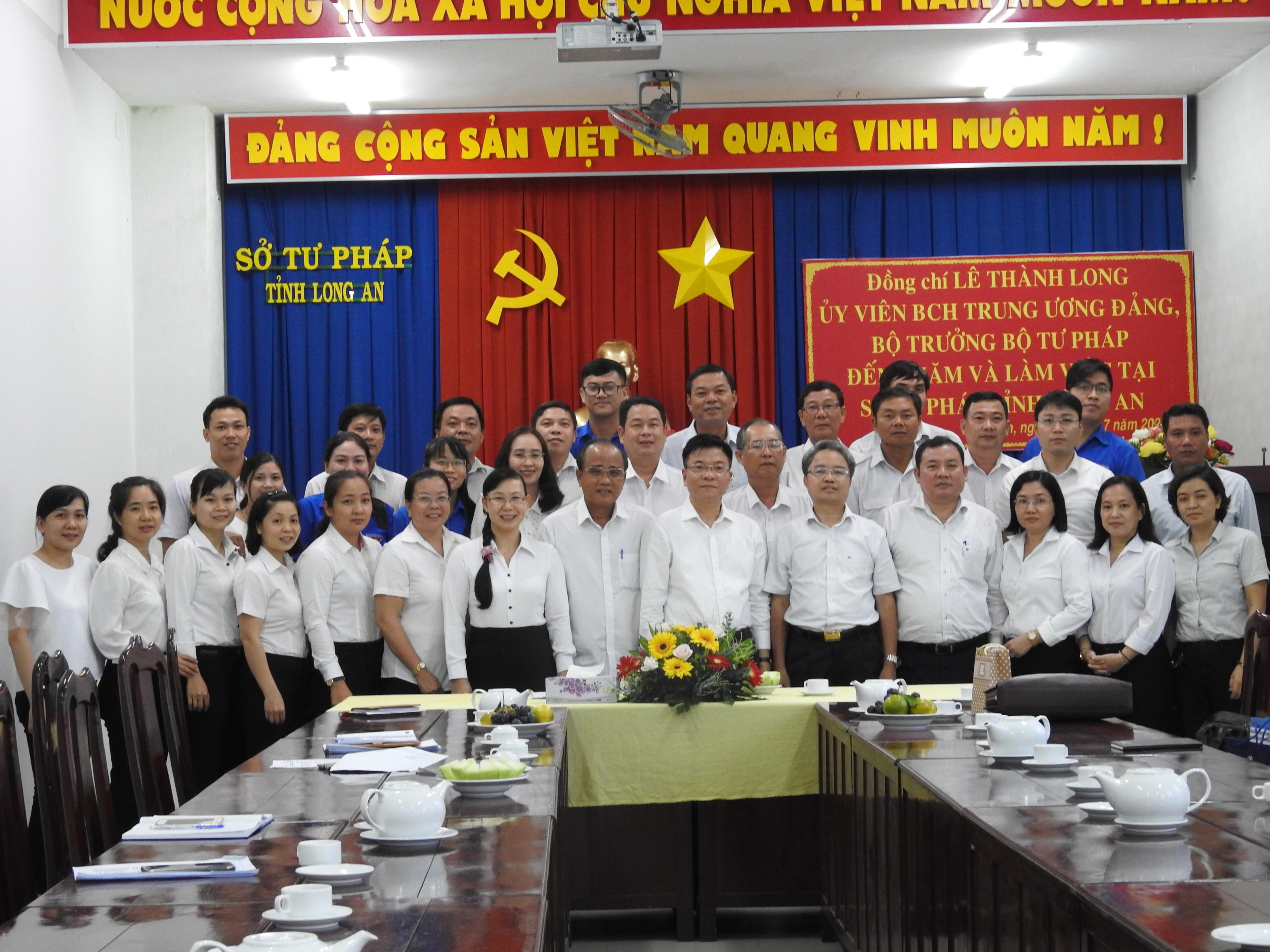 (PLVN) -Chiều ngày 6/7 Đoàn công tác Bộ Tư pháp do Bộ trưởng Lê Thành Long dẫn đầu đã tới thăm, làm việc với Cục Thi hành án dân sự và Sở Tư pháp tỉnh Long An. Tham dự đoàn công tác có Tổng cục trưởng Tổng cục Thi hành án dân sự Nguyễn Quang Thái, Cục trưởng cục công tác phía Nam Nguyễn Thanh Bình, cùng lãnh đạo, cán bộ Cục thi hành án dân sự, Sở Tư pháp.