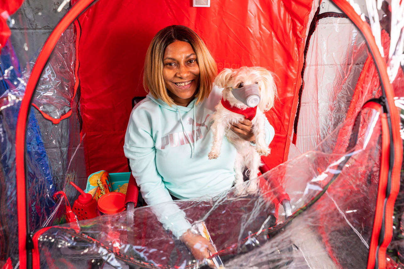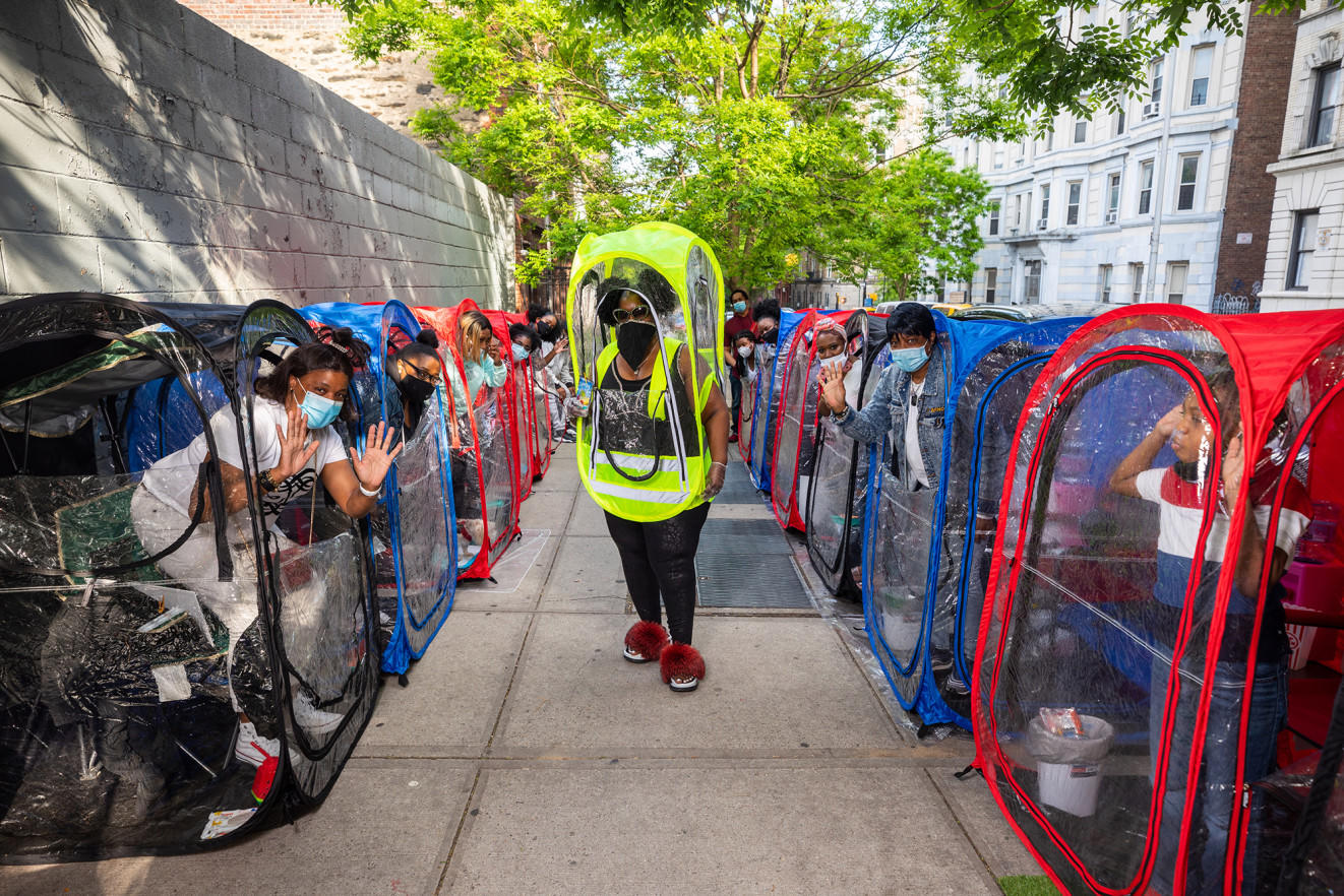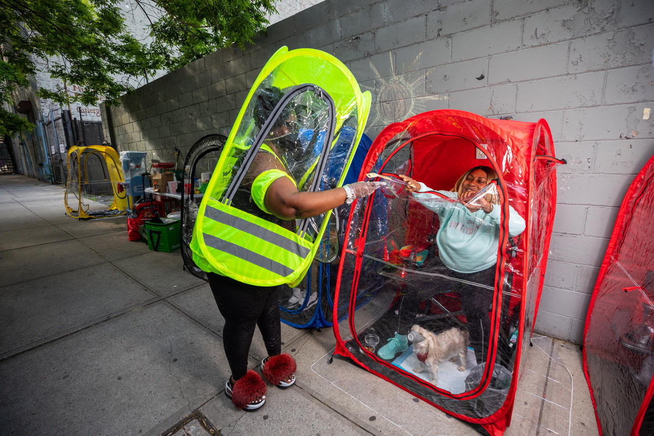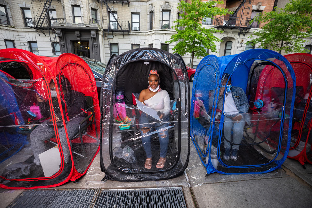 Do mọi người phải ở trong nhà nhiều tháng, Theresa Smythe (giữa), 49 tuổi, đã nghĩ ra cách sử dụng những chiếc lều nhựa cá nhân để tổ chức tiệc tùng, nói chuyện với bạn bè.