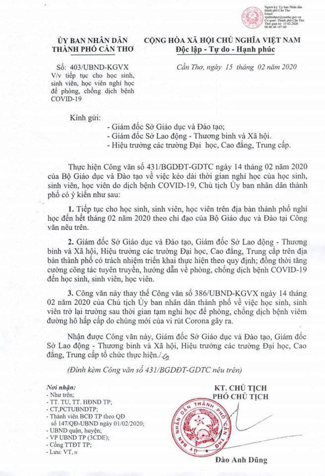 Ngày 15/2, ông Đào Anh Dũng - Phó Chủ tịch UBND thành phố Cần Thơ đã ký văn bản tiếp tục cho học sinh, sinh viên, học viên nghỉ học đến hết tháng 2 để phòng, chống dịch Covid-19. Công văn này thay thế công văn đã được ban hành trước đó về việc cho học sinh, sinh viên trở lại nhập học vào ngày 17/2.