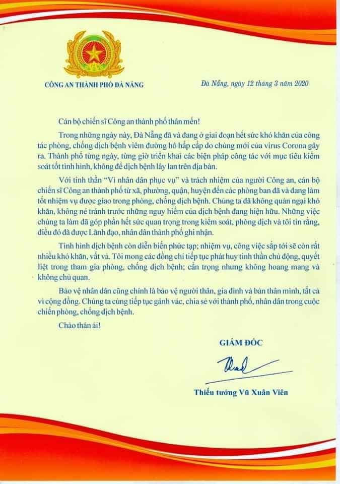 Liên quan đến vụ việc, chiều 12/3, Thiếu tướng Vũ Xuân Viên, Giám đốc Công an TP. Đà Nẵng đã viết thư động viên các chiến sỹ Công an đang làm nhiệm vụ trong mùa dịch Covid-19.