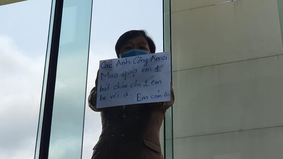 Cháu bé cần có chế độ ăn đặc biệt, ngày 12/3, người mẹ ghi vào mảnh giấy: “Các anh công an ơi. Mua giúp em 1 bát cháo cho 1 em bé với ạ. Em cảm ơn". Trung úy Tán Thanh Tùng (Đội trực bảo vệ) đã lập tức giơ tay ra dấu hiệu đồng ý. Chỉ khoảng 20 phút sau, cháo của em nhỏ đã được các chiến sỹ công an chuẩn bị xong và đưa cho nhân viên Y tế mang vào cho người mẹ trẻ.