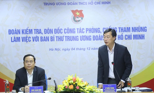 Sáng 4/12, Đoàn Công tác Ban Chỉ đạo Trung ương về PCTN do ông Trần Thanh Mẫn, Bí thư Trung ương Đảng, Chủ tịch UBTƯ MTTQ Việt Nam, Ủy viên Ban Chỉ đạo Trung ương về PCTN làm trưởng đoàn đã có cuộc làm việc với Ban Bí thư Trung ương Đoàn TNCS Hồ Chí Minh.