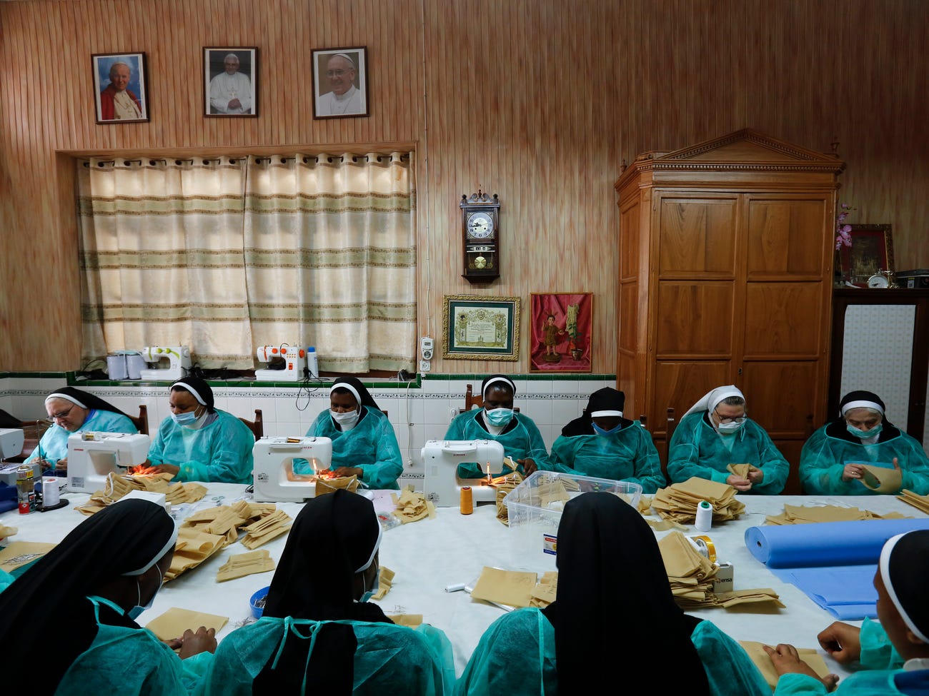 Các nữ tu may khẩu trang cho nhân viên y tế, cảnh sát và bất cứ ai trong thành phố cần khẩu trang. Họ làm được khoảng 500 khẩu trang/ngày và đã quyên góp khoảng 5.000 cho thành phố, theo trang tin địa phương eldiario.es.