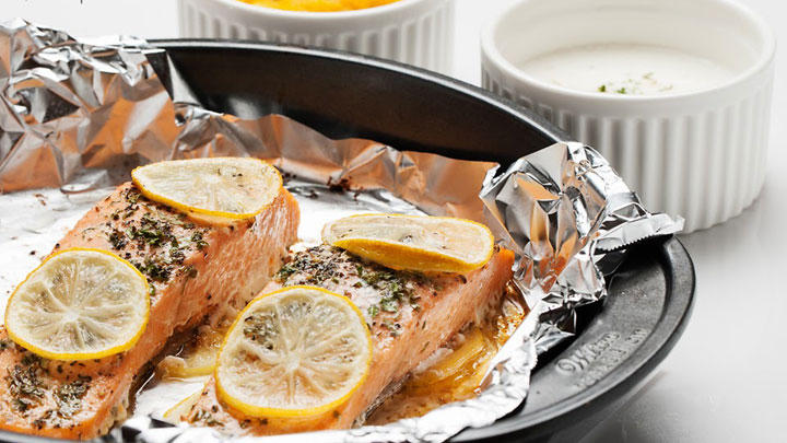 - Dùng kẹp gắp gói cá hồi nướng ra ngoài. Cẩn thận mở nhẹ lớp giấy bạc và lấy cá hồi đặt vào đĩa. Thưởng thức ngay với món ăn ưa thích của bạn.