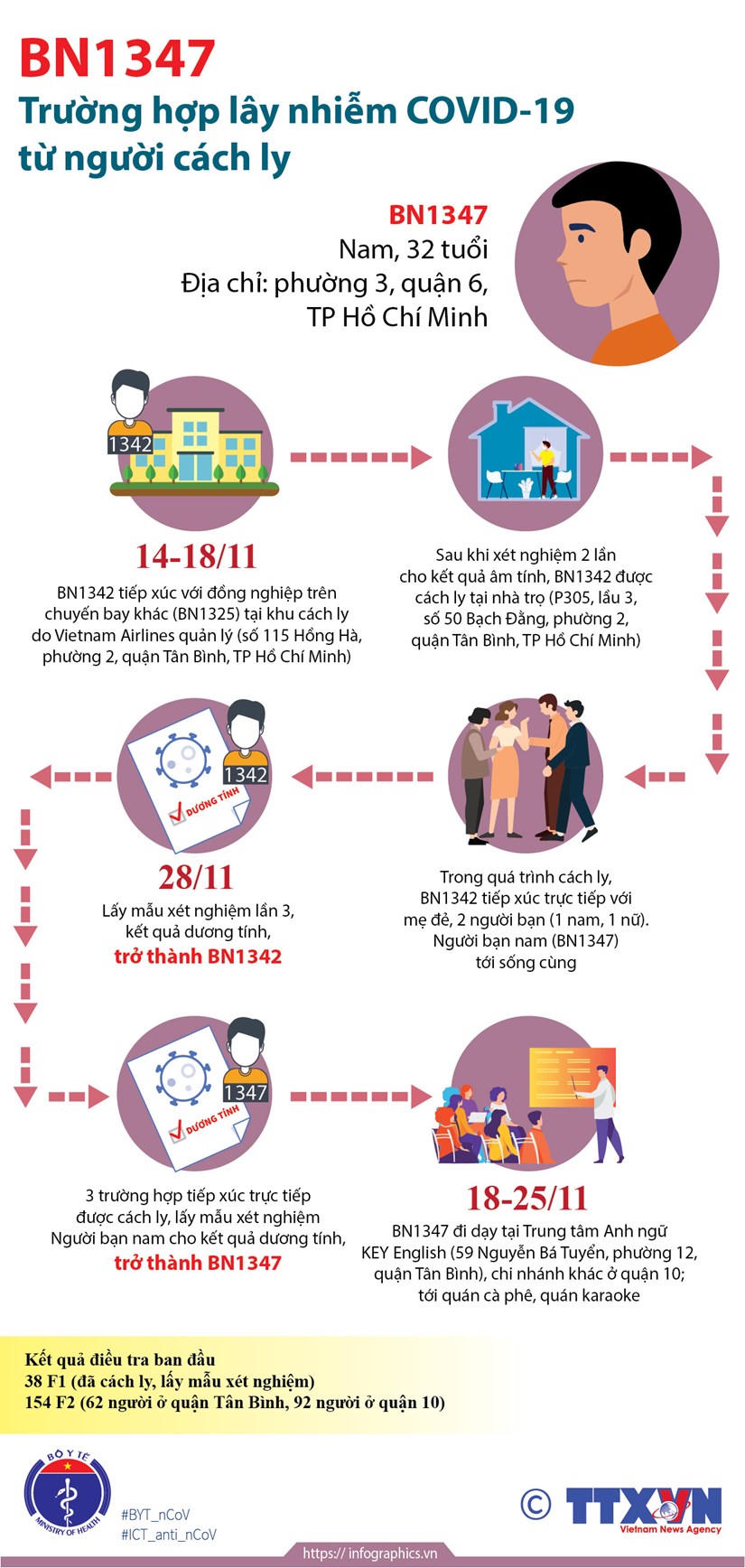 Ngày 30/11, trên địa bàn TP. Hồ Chí Minh xác định 2 trường hợp mắc COVID-19 mới là bệnh nhân 1342 (nam, sinh năm 1992, quốc tịch Việt Nam, là tiếp viên của Hãng hàng không Vietnam Airlines) và bệnh nhân 1347 (nam, sinh năm 1988, quốc tịch Việt Nam, giáo viên tiếng Anh, bạn của bệnh nhân 1342).